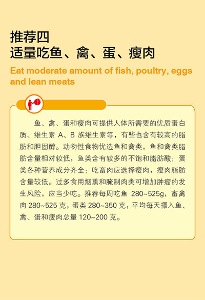 鱼、禽、蛋和瘦肉摄入要适量。