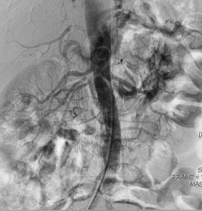 近日,我院放射科成功完成一例复杂型肾动脉狭窄介入治疗。患者,女,39岁,以“高血压”就诊,血压最高时达172/115mmHg,CT检查发现双肾动脉狭窄,且右肾为两支肾动脉(主肾动脉、副肾动脉各一支)均狭窄,副肾动脉重度狭窄(狭窄率达90%)。经过术前积极准备,放射科主任张来安主治医师、李继兵主治医师为患者实施了肾动脉球囊扩张介入治疗,为了达到最好疗效,术中对三支狭窄肾动脉均进行了球囊扩张。术后一周,血压即恢复到了正常。经过近期随访,患者血压稳定在125/85mmHg。