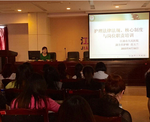 416365娱乐场2015年上半年护士制度职责培训在医院门诊七楼会议室举行,来自各个科室的护理人员积极参加培训,会场座无虚席。